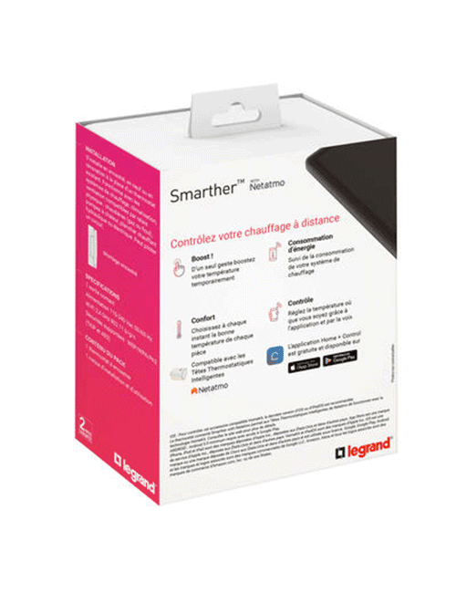 Ce thermostat vous permet de visualiser l’historique de votre consommation d’énergie et de consulter la fonction « Bilan Économies d’Énergie » pour suivre et optimiser votre consommation d’énergie. Le Legrand Smarther encastré fonctionne avec tous types de chaudières individuelles, que ce soit au gaz, au fioul ou au bois, mais également avec les pompes à chaleur.