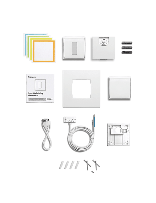 Inclus | 1 relais wifi/zigbee, 1 support mobile, 1 support mural, 1 plaque murale, 1 adaptateur chaudière, 4 adhésifs de couleur, 3 piles, 4 vis et 4 chevilles |